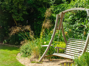 The original swing seat remains in situ, nestled into an expanded gravel area with enhanced aromatic planting, while a new focal tree opposite screens neighbouring windows and anchors the view from the house.